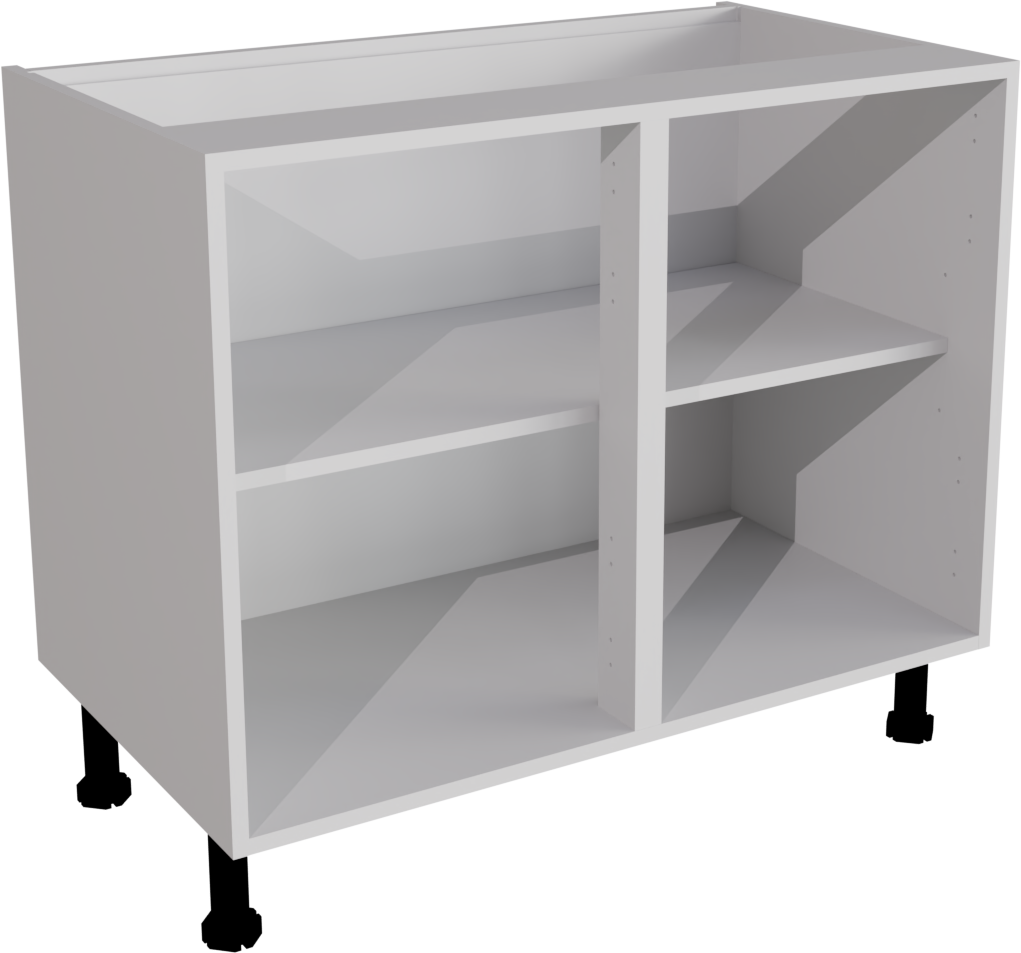 It is a grey double kitchen base cabinet that is suitable for use as either a drawerline or highline base cabinet. It is made of 18mm MFC with an 8mm MDF back.