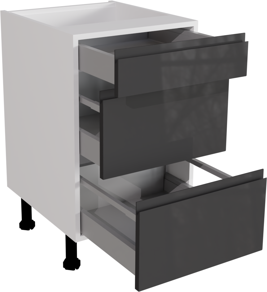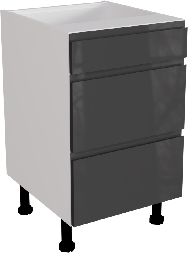 This is a 500mm handleless, gloss graphite 3 drawer kitchen base unit. It is a matt base unit with two Hettich soft close pan drawers with high gloss graphite jayline drawer fronts. This listing includes the following parts: