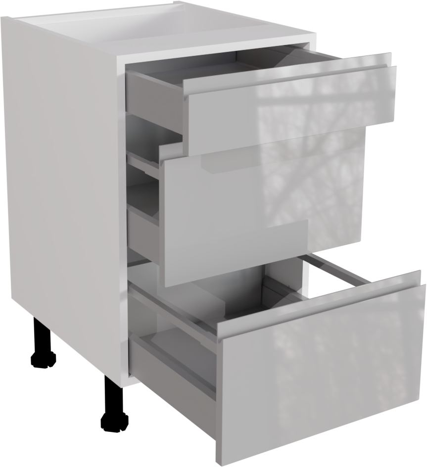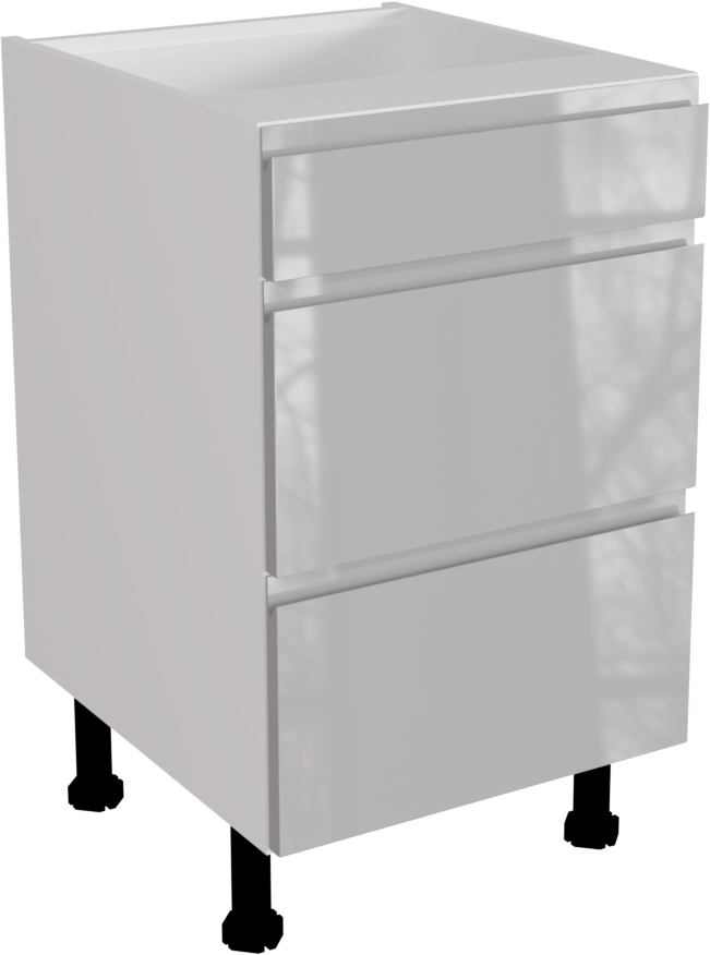 This is a 500mm handleless, gloss light grey 3 drawer kitchen base unit. It is a matt base unit with two Hettich soft close pan drawers with high gloss light grey jayline drawer fronts. This listing includes the following parts: