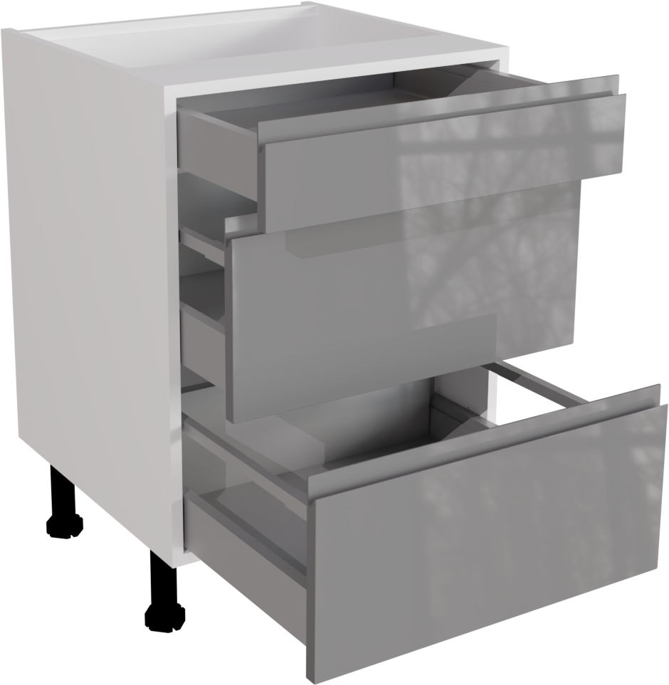 This is a 600mm handleless, gloss dust grey kitchen 3 drawer base unit. It is a 600mm matt base cabinet with three high gloss dust grey jayline drawer fronts. The drawers are soft-close drawers. This listing includes the following parts: