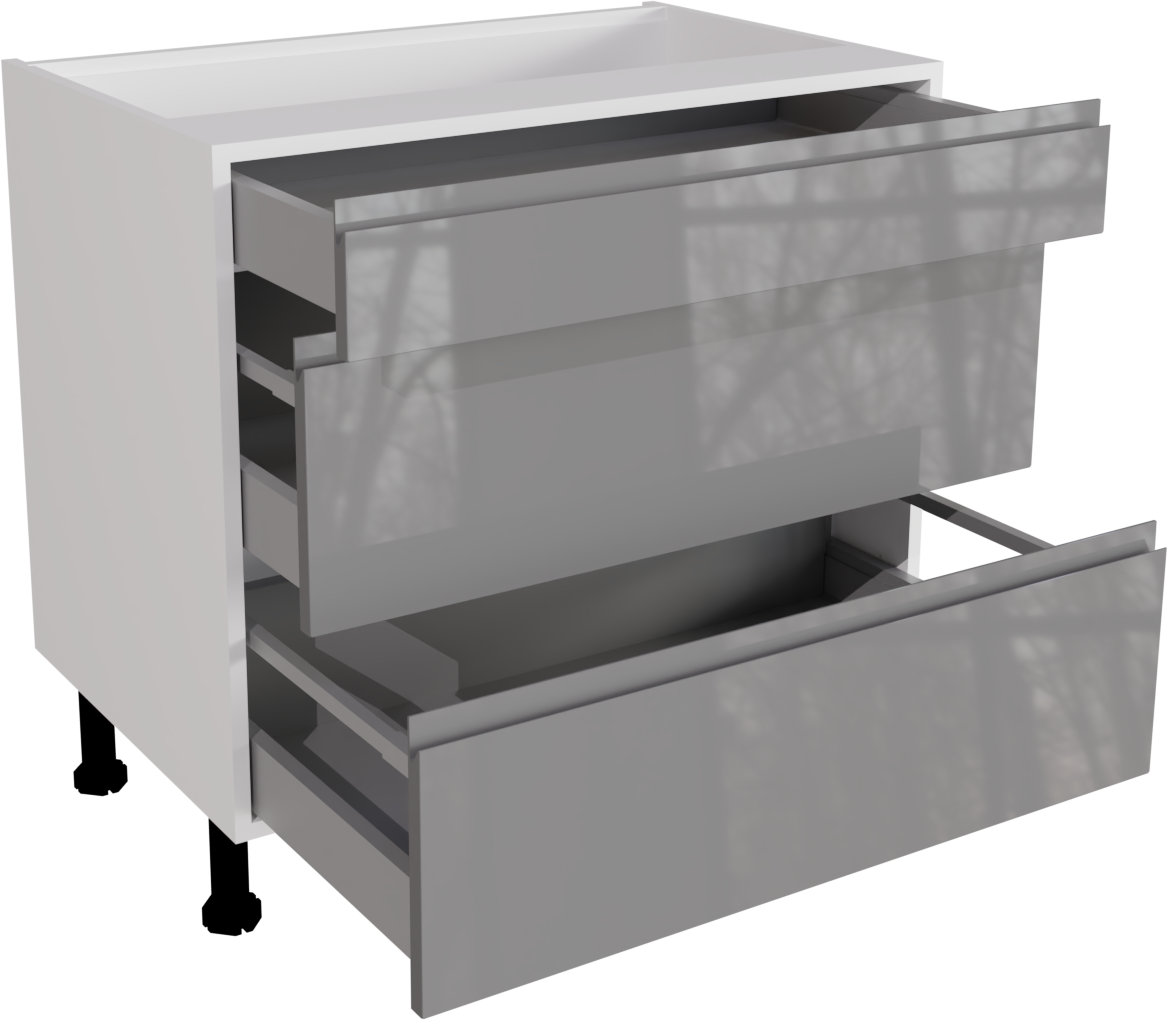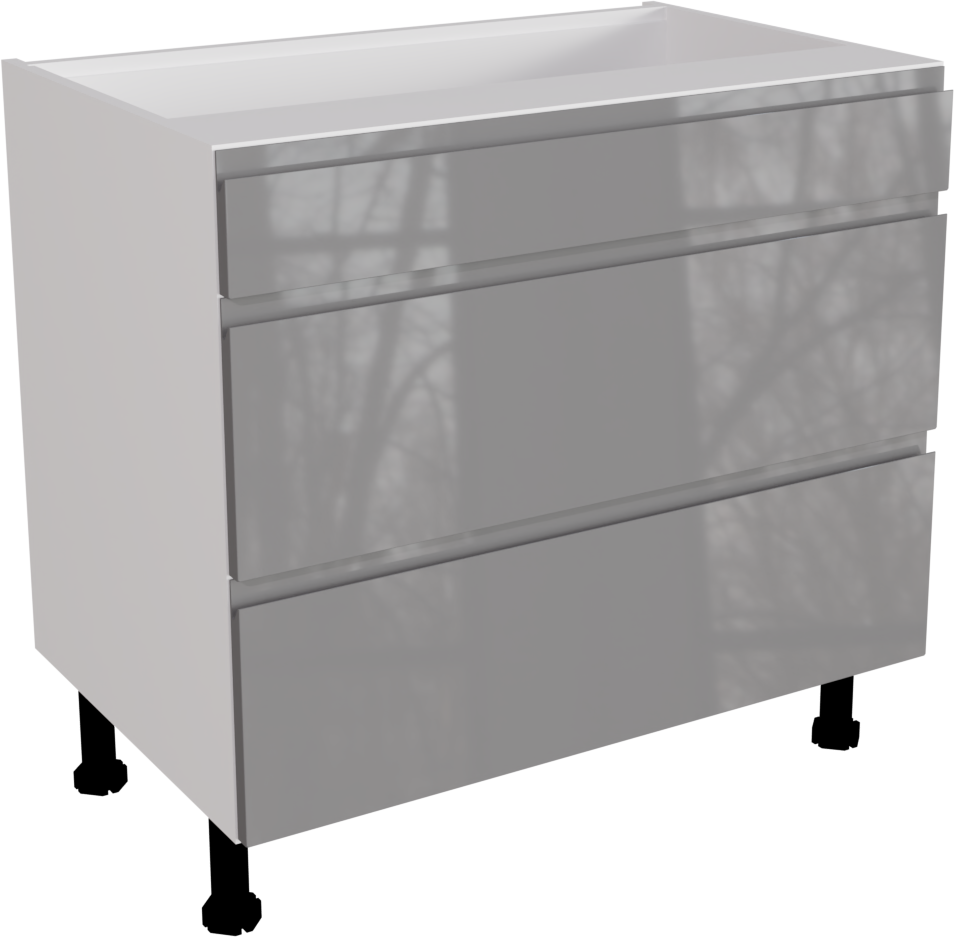 This is a 900mm handleless gloss dust grey 3 drawer kitchen base unit. This unit includes the following parts: