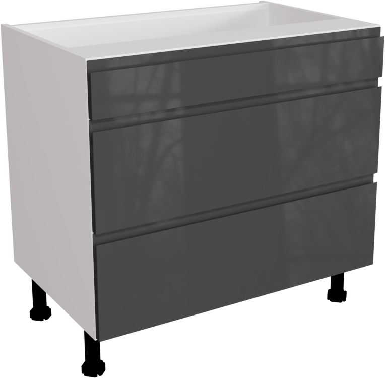 This is a 900mm handleless gloss graphite 3 drawer kitchen base unit. This unit includes the following parts: