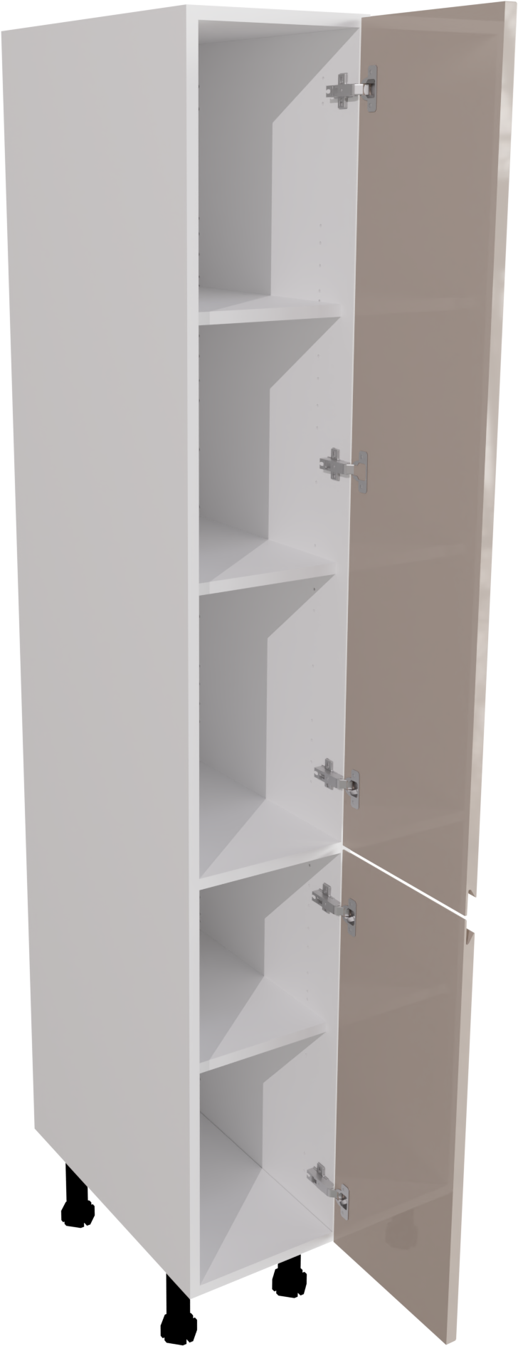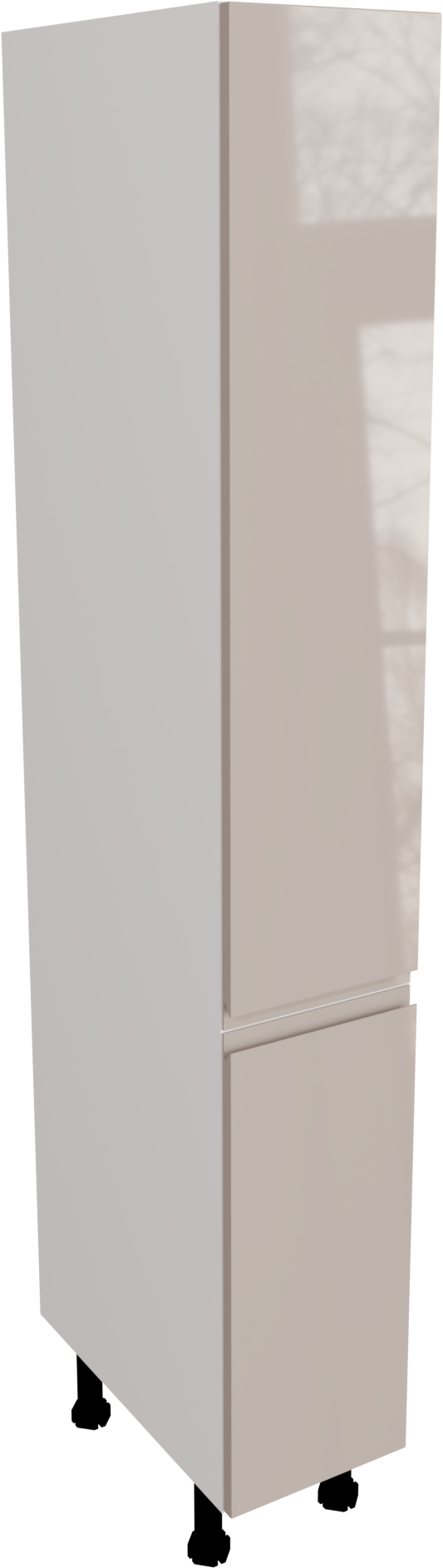 This is a 300mm handleless, high gloss cashmere kitchen larder unit. It is a 300mm wide matt cabinet with jayline cashmere gloss doors. This listing includes the following parts: