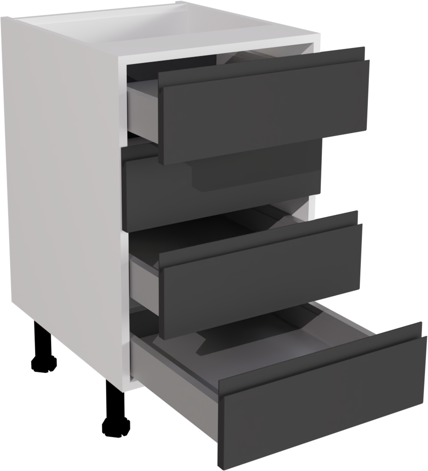 The 500mm Handleless Matt Graphite Kitchen 4 Drawer Base Unit, crafted with precision in Britain, harmonises modern aesthetics with practical functionality, featuring a sleek design and luxurious matt graphite finish. With four spacious drawers, it offers efficient storage solutions while seamlessly enhancing the elegance of contemporary kitchen spaces. This listing includes includes the following parts:
