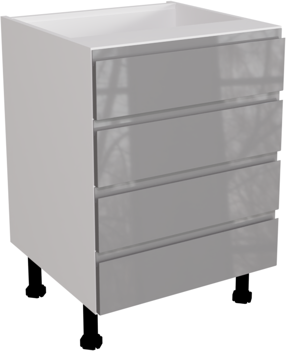 This is a 600mm handleless, gloss dust grey kitchen 4 drawer base unit available to buy online now. The unit includes the base cabinet, four gloss dust grey jayline doors and four soft close drawers. In this pack you will receive the following: