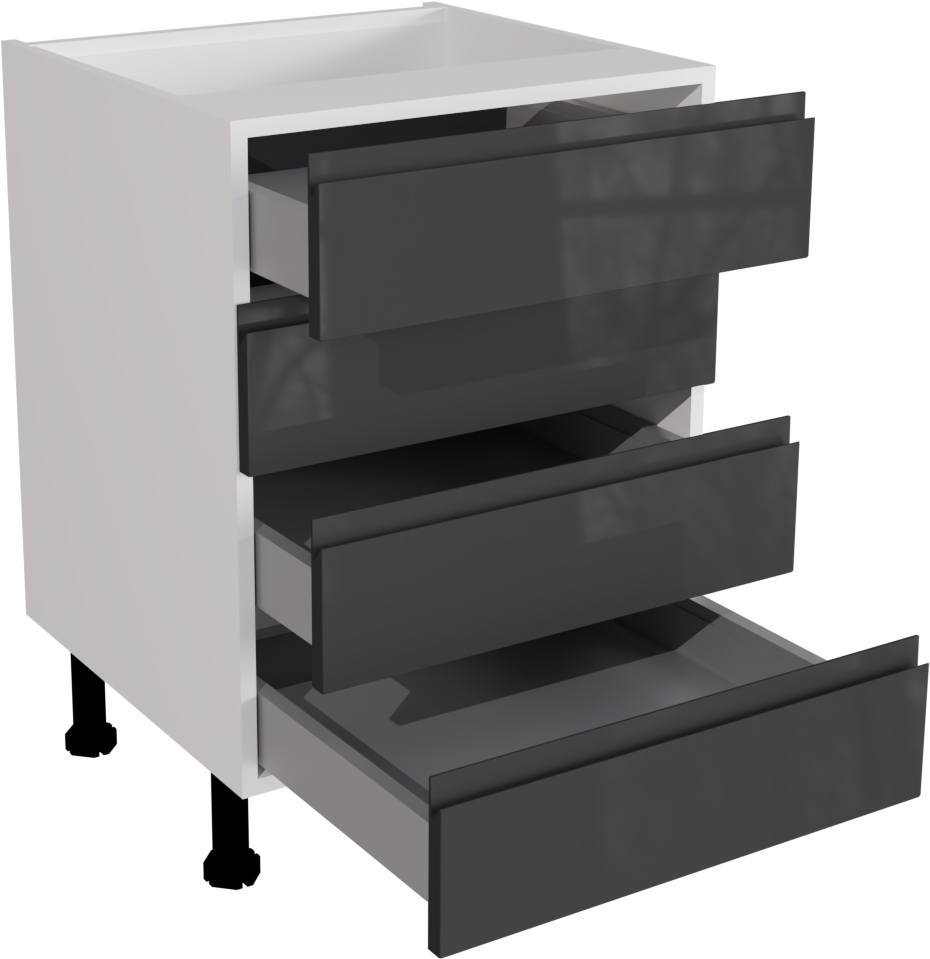 This is a 600mm handleless, gloss graphite kitchen 4 drawer base unit available to buy online now. The unit includes the base cabinet, four gloss graphite jayline doors and four soft close drawers. In this pack you will receive: