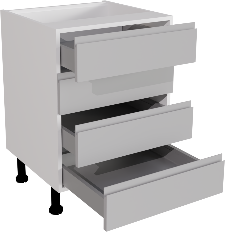 The 600mm Handleless Matt Light Grey Kitchen 4 Drawer Base Unit combines modern aesthetics and practical storage, offering versatility and elegance with its sleek design and sophisticated light grey finish, perfect for contemporary kitchen spaces.