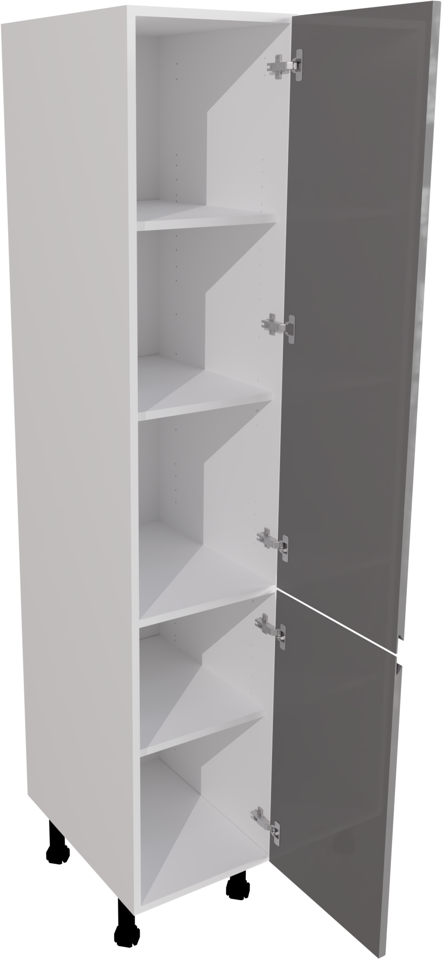 This is a 400mm handleless, gloss dust grey kitchen larder unit. It is a 400mm wide larder cabinet with two jayline high gloss dust grey doors. This unit includes the following parts: