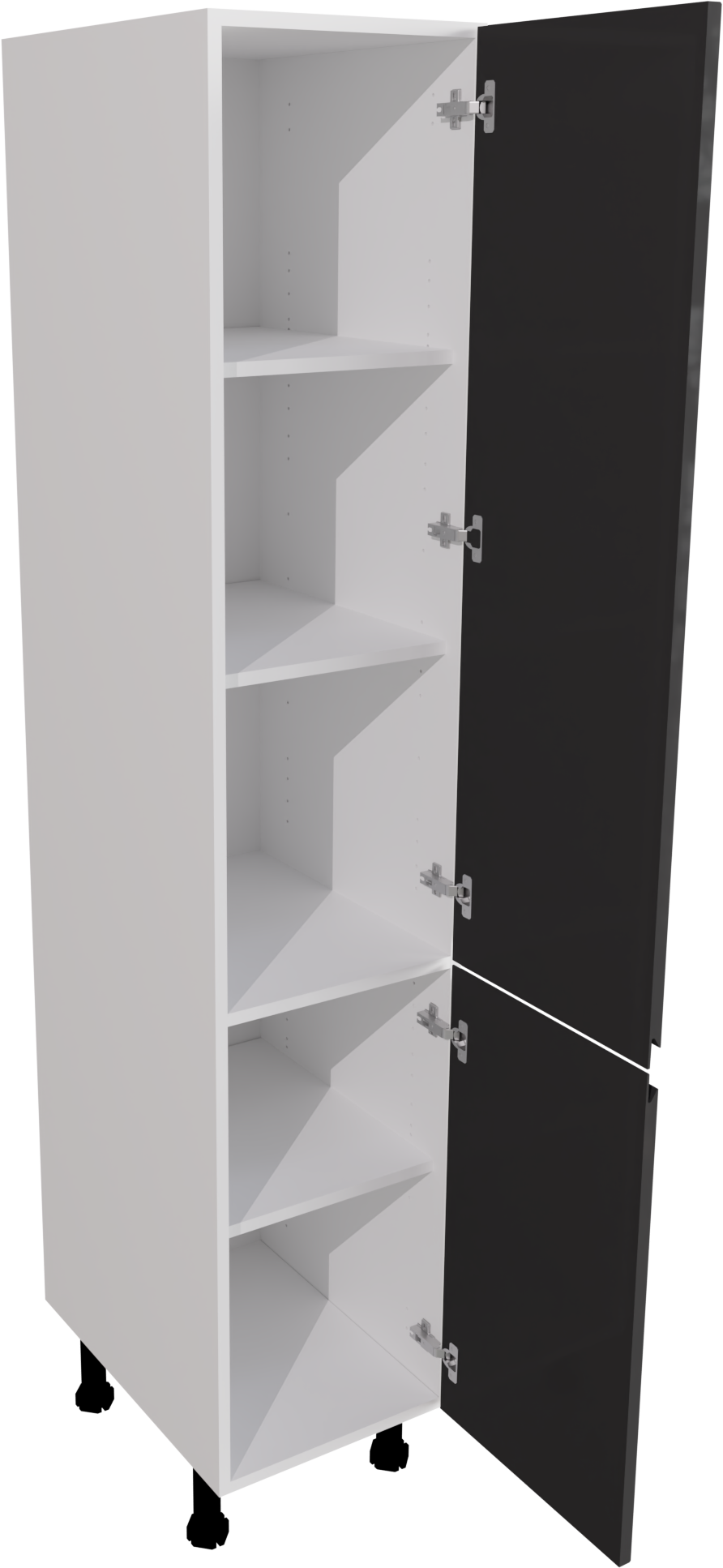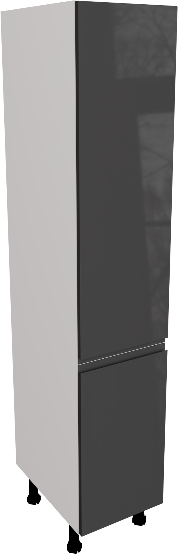 This is a 400mm handleless, gloss graphite kitchen larder unit. It is a 400mm wide larder cabinet with two high gloss jayline graphite doors. This unit includes the following parts: