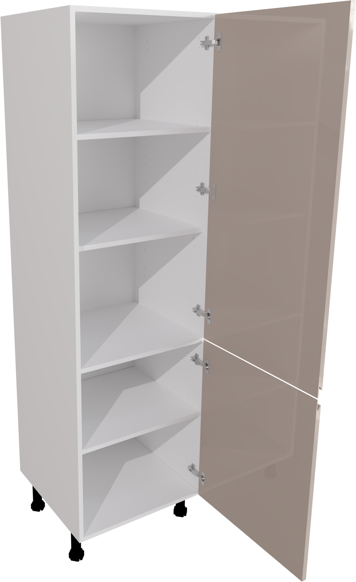 This is a 600mm handleless, gloss cashmere larder unit available to buy now. The unit comes complete with two jayline high gloss cashmere doors, a matt larder cabinet, hinges and legs and a shelf pack containing four shelves (two adjustable, two fixed). This listing includes the following parts: