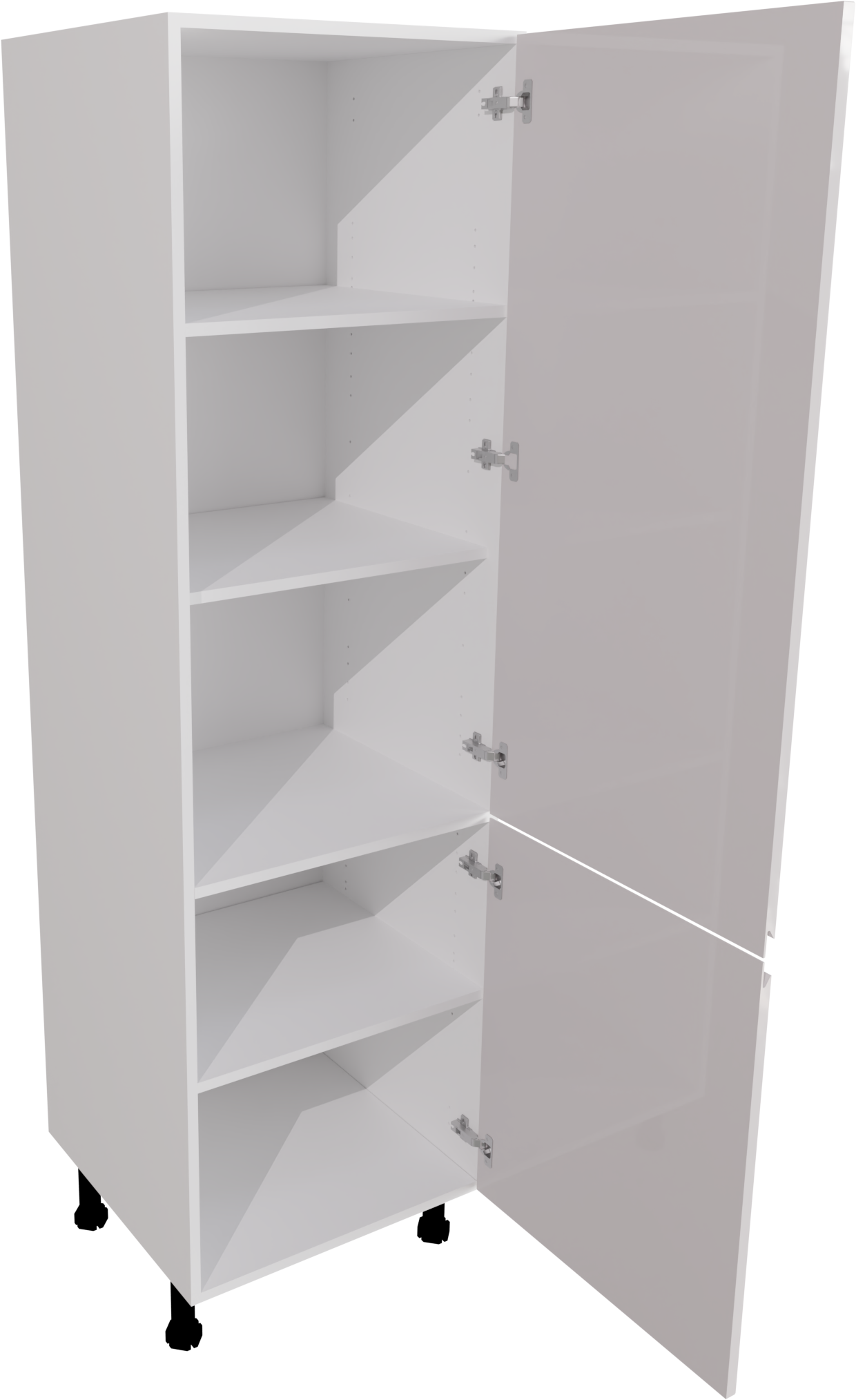 This is a 600mm handleless, gloss white larder unit available to buy now. The unit comes complete with two jayline high gloss white doors, a matt larder cabinet, hinges and legs and a shelf pack containing four shelves (two adjustable, two fixed). This listing includes the following parts: