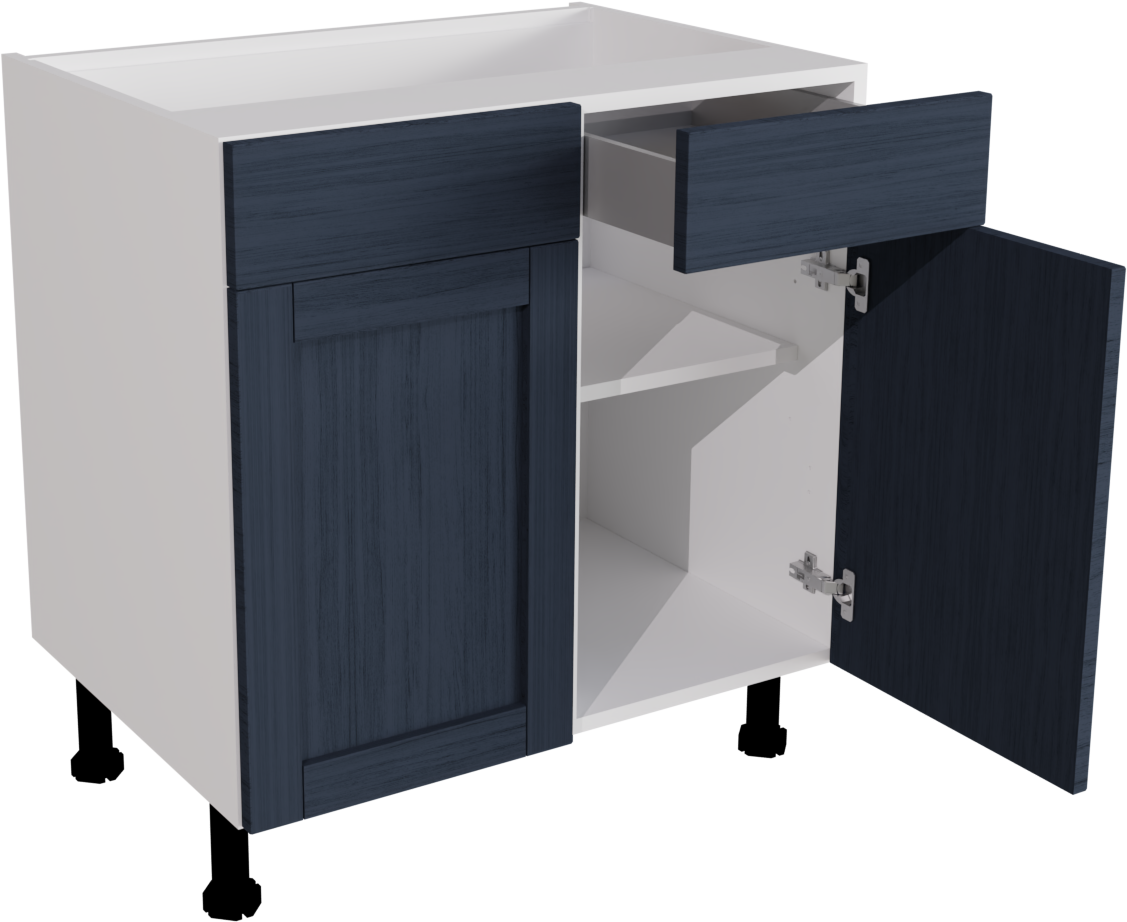 Information: 1 x 720 Base DD 800 ClicBox White 1 x Waterford Woodgrain Indigo Blue Pronto Door 570x396 1 x Waterford Woodgrain Indigo Blue Pronto Door 570x396 2 x Standard Hettich Hinge Pack (pair) Silver CPFITT0216 2 x Waterford Woodgrain Indigo Blue Pronto Door 140x396 2 x 400W Atira Standard Drawer