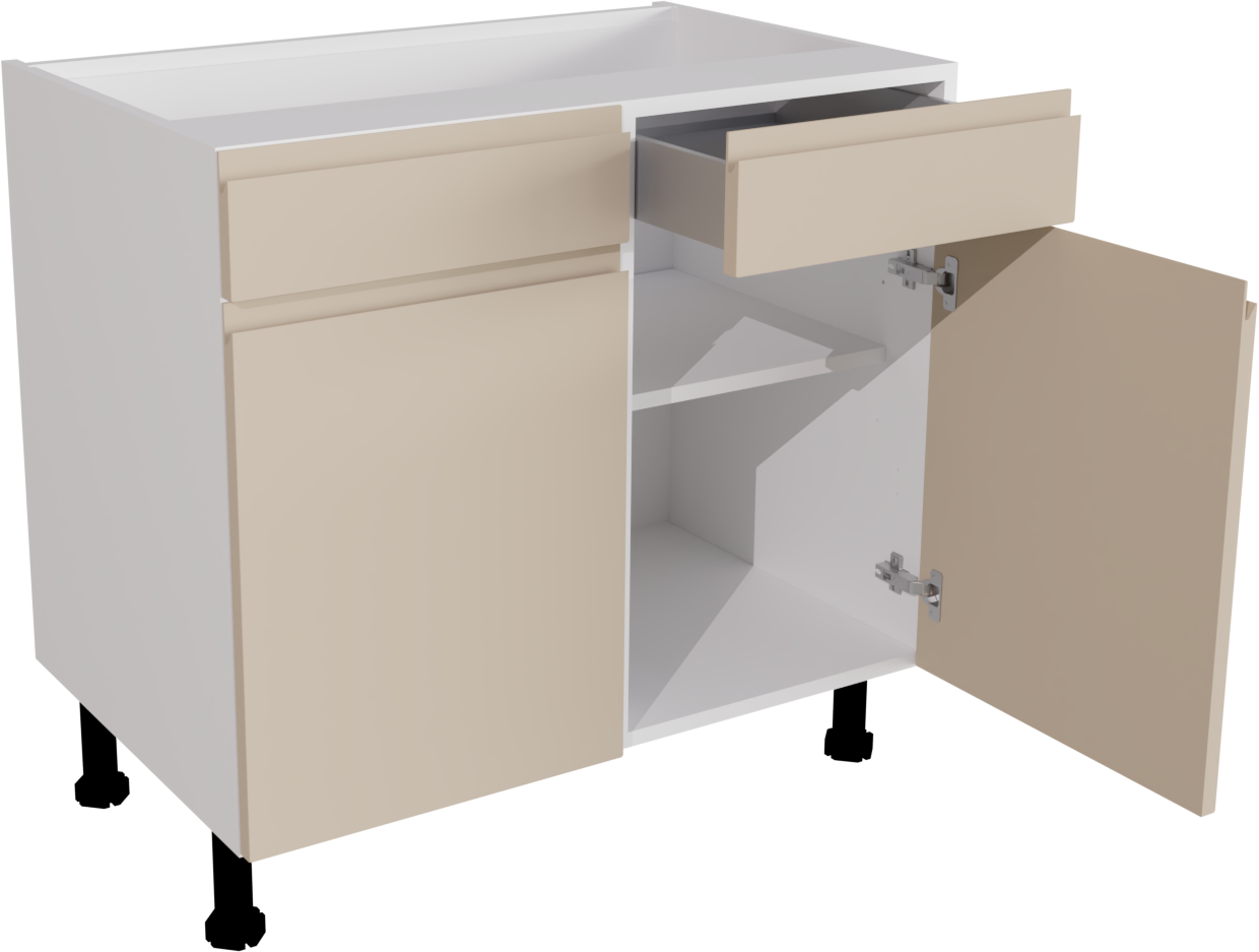 Information: 1 x 720 Base DD 900 NB White 1 x Jayline Supermatt Cashmere Pronto Door 570x446 1 x Jayline Supermatt Cashmere Pronto Door 570x446 2 x Standard Hettich Hinge Pack (pair) Silver CPFITT0216 2 x Jayline Supermatt Cashmere Pronto Door 140x446 2 x 450W Atira Standard Drawer