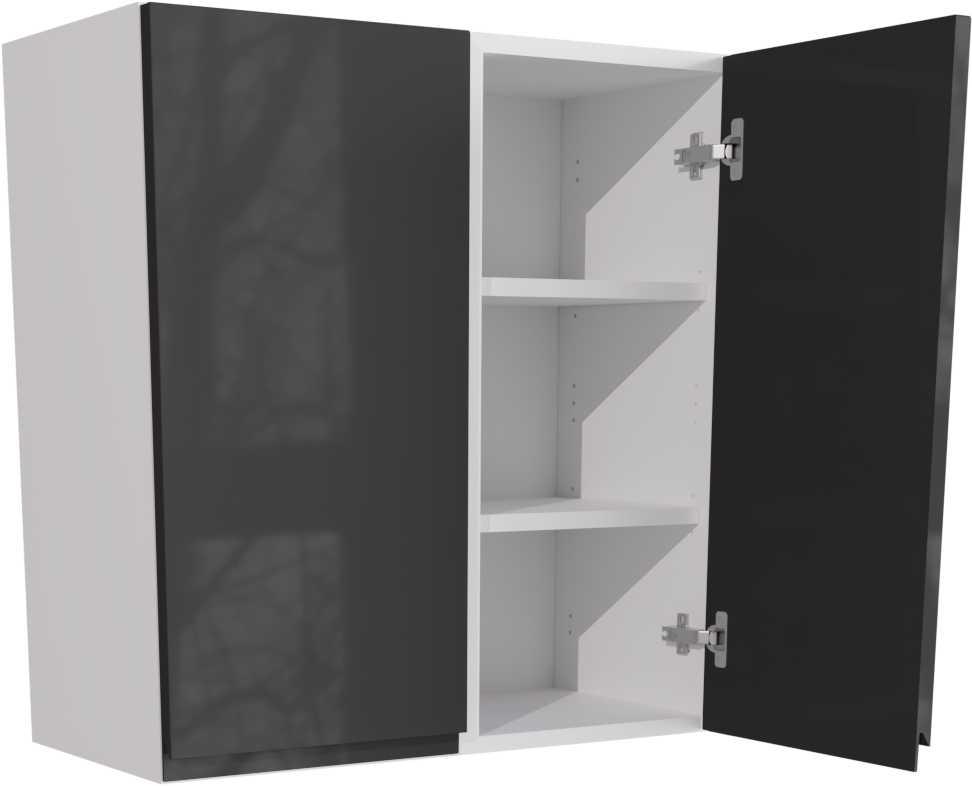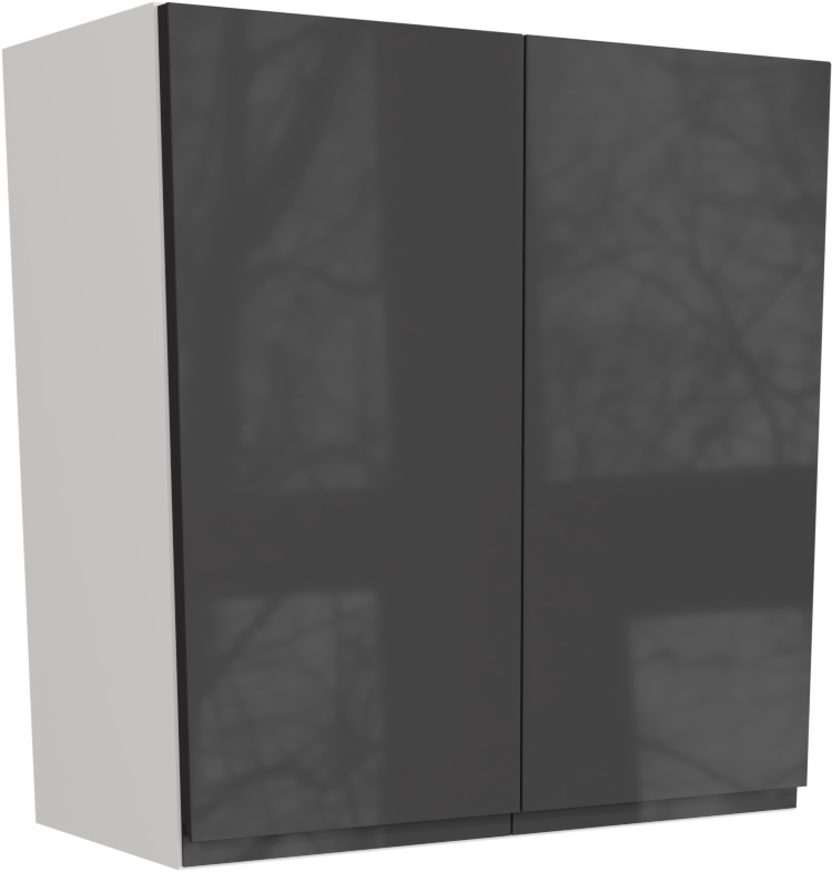 This is a 700mm handleless high gloss graphite kitchen wall unit with two high gloss graphite jayline kitchen doors. The unit consists of a 700mm kitchen wall cabinet, two 350mm doors, four soft close hinges, two shelves and wall hanging brackets. Everything you need to assemble your kitchen unit and hang it on the wall.