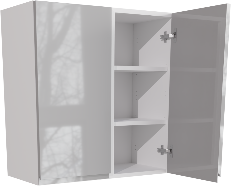 This is a 700mm handleless high gloss light grey kitchen wall unit with two high gloss light grey jayline kitchen doors. The unit consists of a 700mm kitchen wall cabinet, two 350mm jayline doors, four soft close hinges, two shelves and wall hanging brackets. Everything you need to assemble your kitchen unit and hang it on the wall.