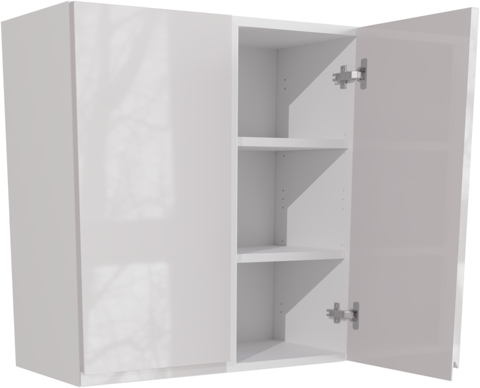 This is a 700mm handleless high gloss white kitchen wall unit with two high gloss white jayline kitchen doors. The unit consists of a 700mm kitchen wall cabinet, two 350mm doors, four soft close hinges, two shelves and wall hanging brackets. Everything you need to assemble your kitchen unit and hang it on the wall.