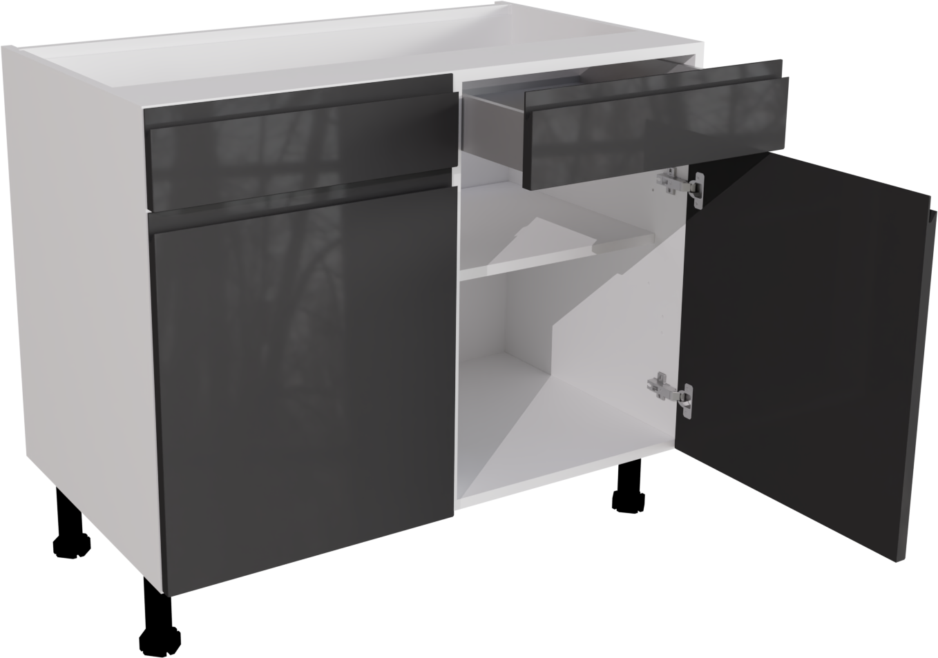 This is a handleless 1000mm high gloss graphite drawer line kitchen base unit. It includes the cabinet, high gloss graphite jayline doors and drawer fronts. This listing includes the following parts: