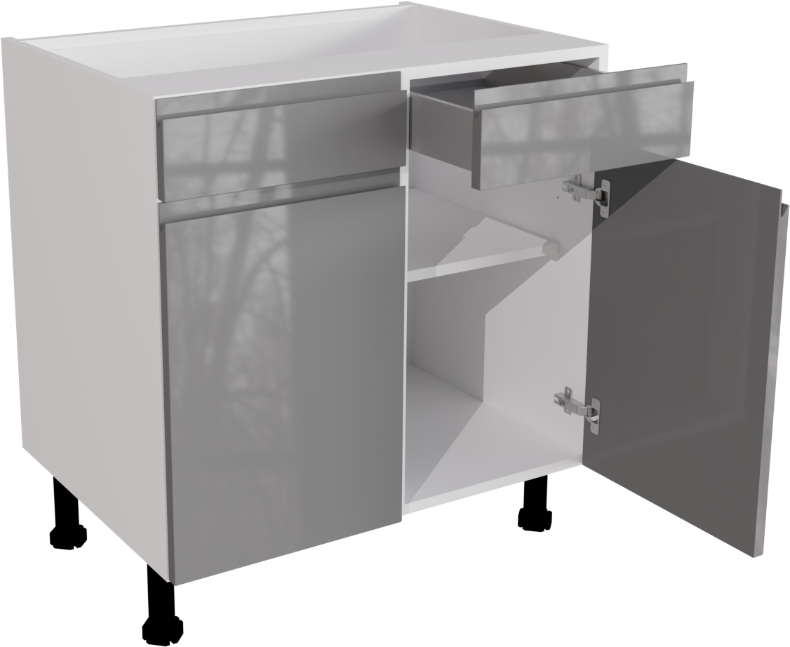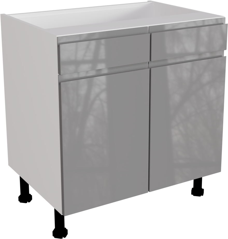 This is a handleless, high gloss dust grey 800mm double drawer line base unit. It is a matt 800mm base unit with two jayline high gloss dust grey drawer fronts and doors. This listing includes the following parts: