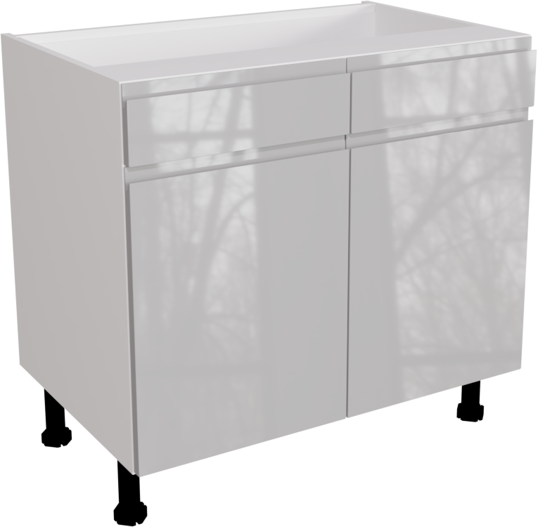This is a handleless 900mm high gloss light grey kitchen base drawer line unit. It includes a 900mm matt cabinet, available in a number of different colours. It also includes two high gloss light grey jayline doors and two high gloss light grey drawer fronts. This listing includes the following parts: