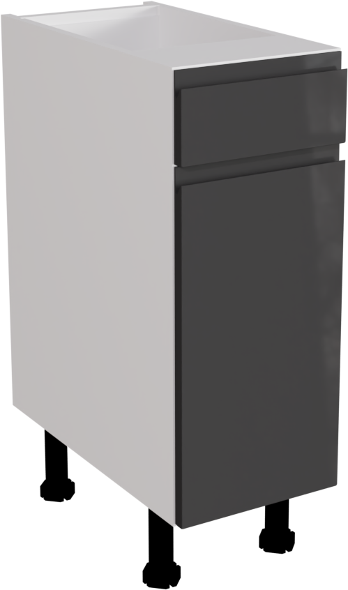 It is a kitchen base unit (matt finish) with a single high gloss graphite jayline door and a high gloss kitchen drawer. Both the door hinges and drawer have integrated soft-close closings. This listing includes the following parts: