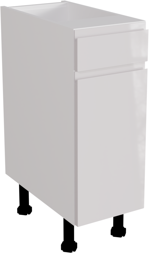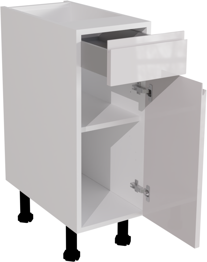 It is a kitchen base unit (matt finish) with a single high gloss kitchen jayline door and a high gloss kitchen drawer. Both the door hinges and drawer have integrated soft-close closings. This listing includes the following parts: