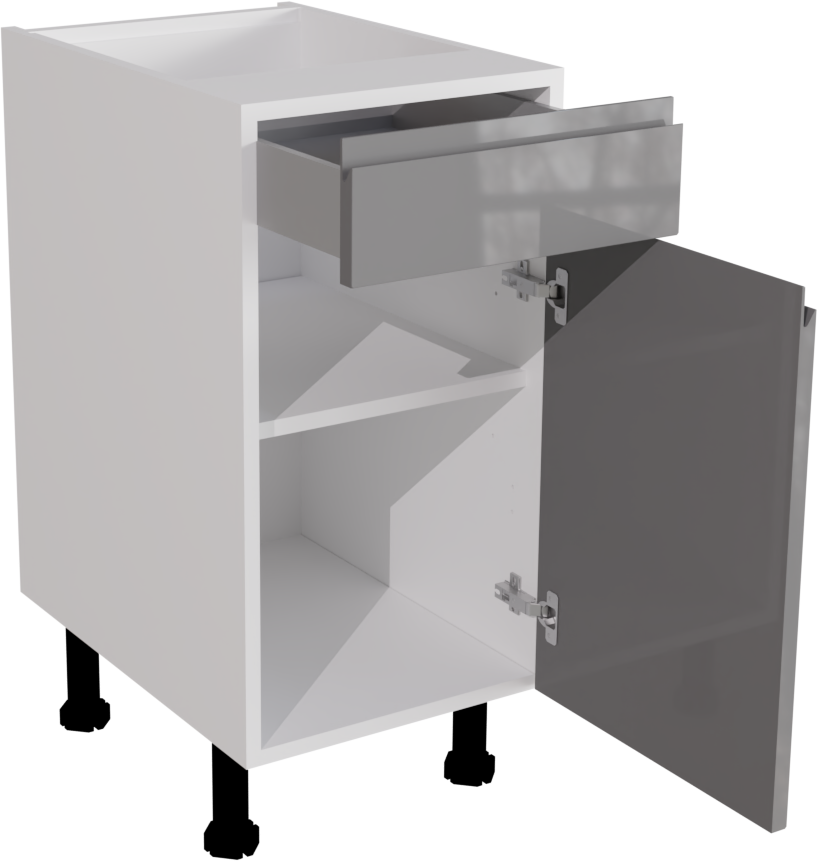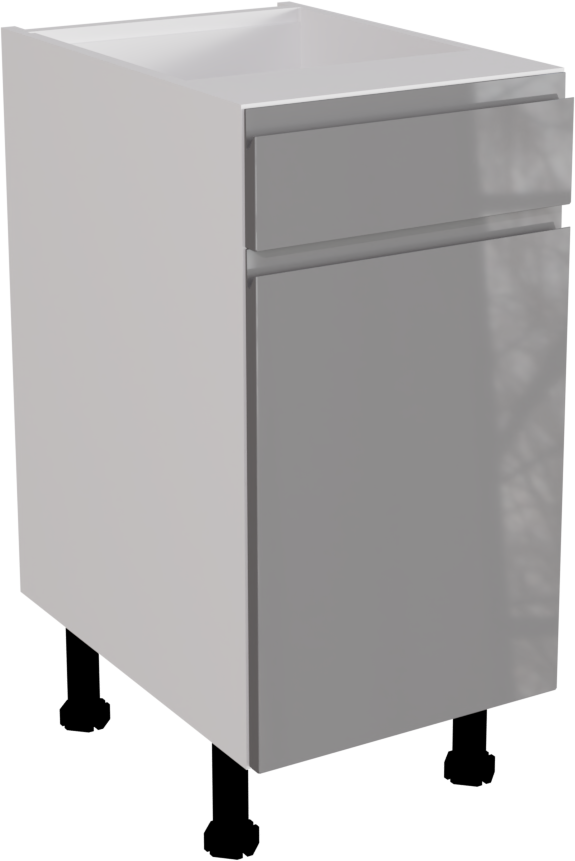 This is a 400mm handleless, high gloss dust grey kitchen drawerline base unit. It is a matt kitchen base cabinet with a high gloss dust grey jayline door and drawer. This listing includes the following parts: