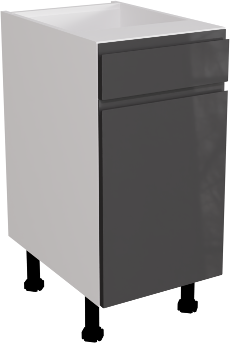 This is a 400mm handleless, high gloss graphite kitchen drawerline base unit. It is a matt kitchen base cabinet with a high gloss graphite jayline door and drawer. This listing includes the following parts: