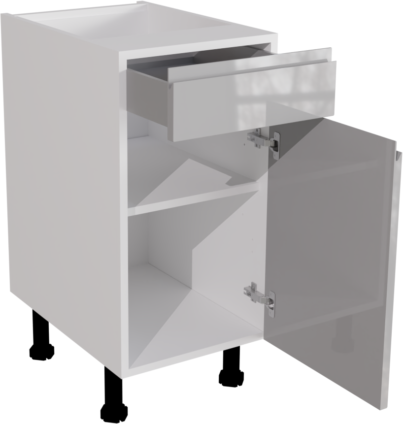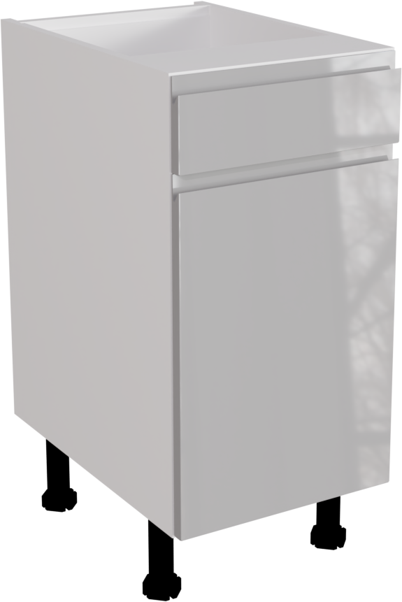 This is a 400mm handleless, high gloss light grey kitchen drawerline base unit. It is a matt kitchen base cabinet with a high gloss light grey jayline door and drawer. This listing includes the following parts: