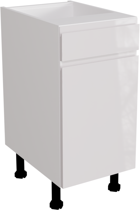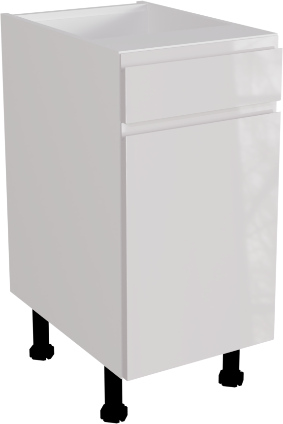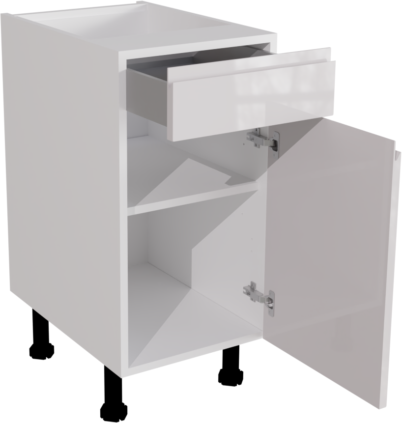 This is a 400mm handleless, high gloss white kitchen drawerline base unit. It is a matt kitchen base cabinet with a high gloss white jayline door and drawer. This listing includes the following parts: