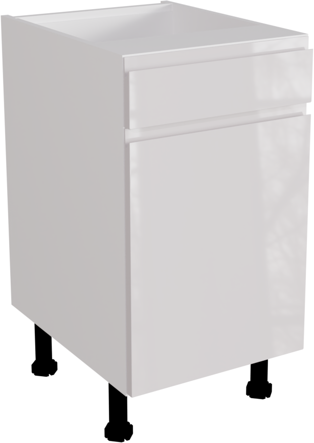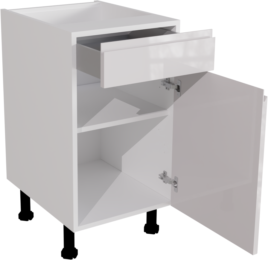 This is a 450mm handleless, high gloss white drawerline kitchen base unit. It is a matt kitchen cabinet with a high gloss jayline door and drawer front. This listing includes the following parts: