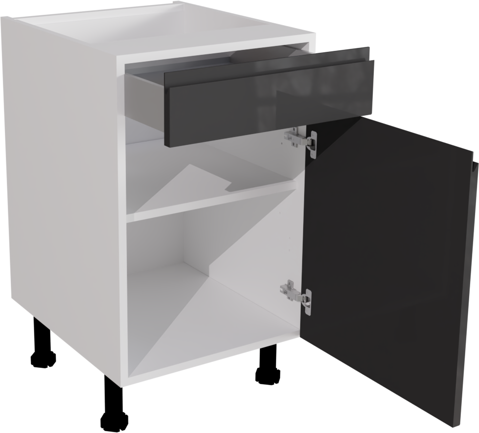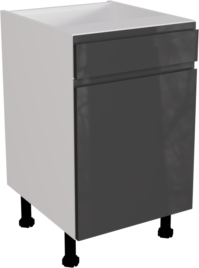 This is a 500mm handleless, high gloss graphite kitchen drawerline base unit. It includes a matt 500mm base cabinet, high gloss graphite jayline door and high gloss drawer front. This listing includes the following parts: