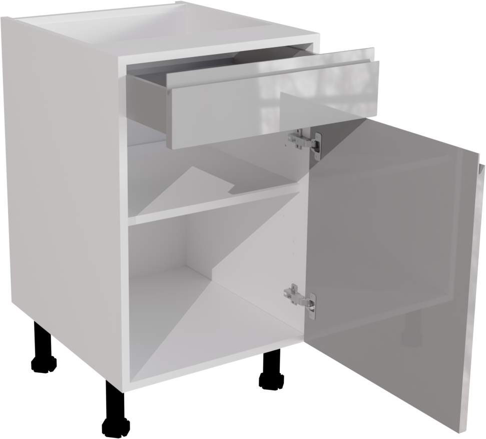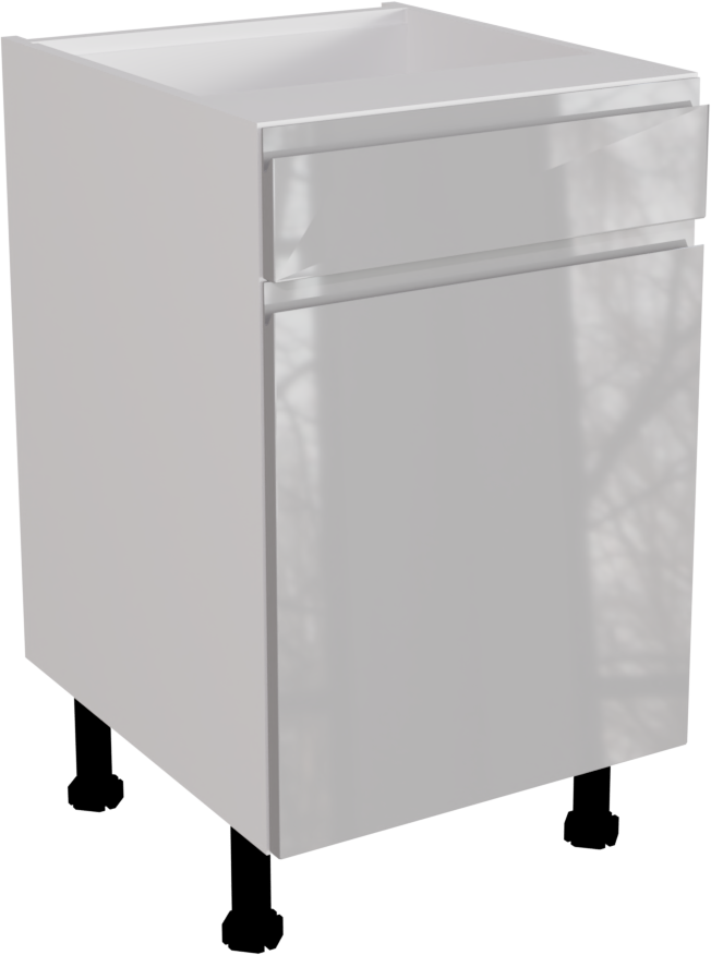 This is a 500mm handleless, high gloss light grey kitchen drawerline base unit. It includes a matt 500mm base cabinet, high gloss light grey jayline door and high gloss drawer front. This listing includes the following parts: