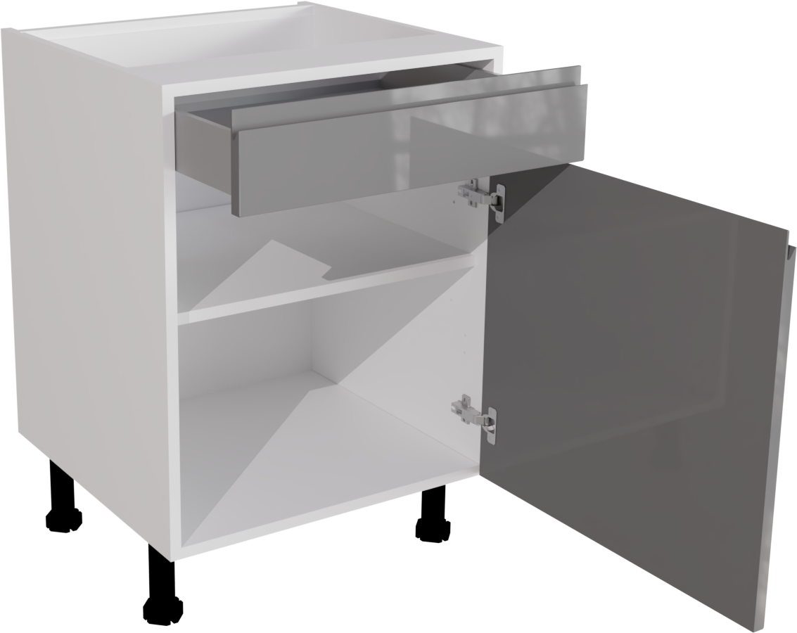 This is a 600mm handleless, high gloss dust grey drawerline kitchen base unit. It is a 600mm matt kitchen cabinet with a jayline dust grey gloss door and drawer front. This listing includes the following parts: