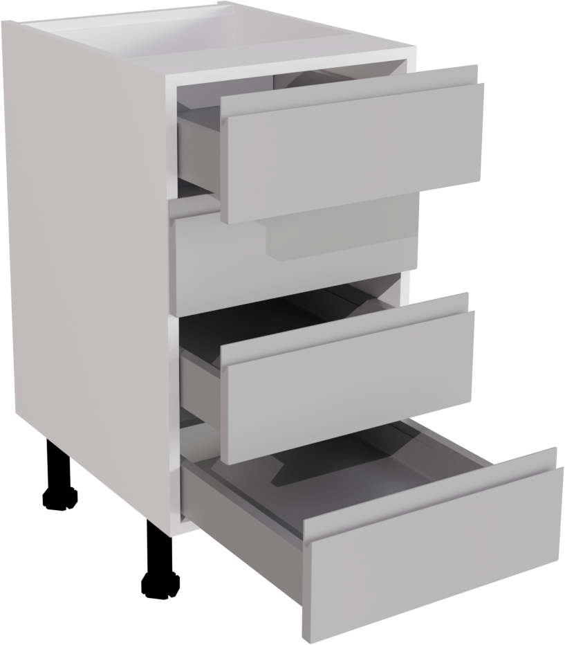The Handleless Matt Light Grey 450 4-Drawer Base unit combines practicality with modern design in kitchen organisation. Crafted with precision and featuring a sleek handleless profile, it optimises storage space while adding a touch of elegance to contemporary culinary environments.