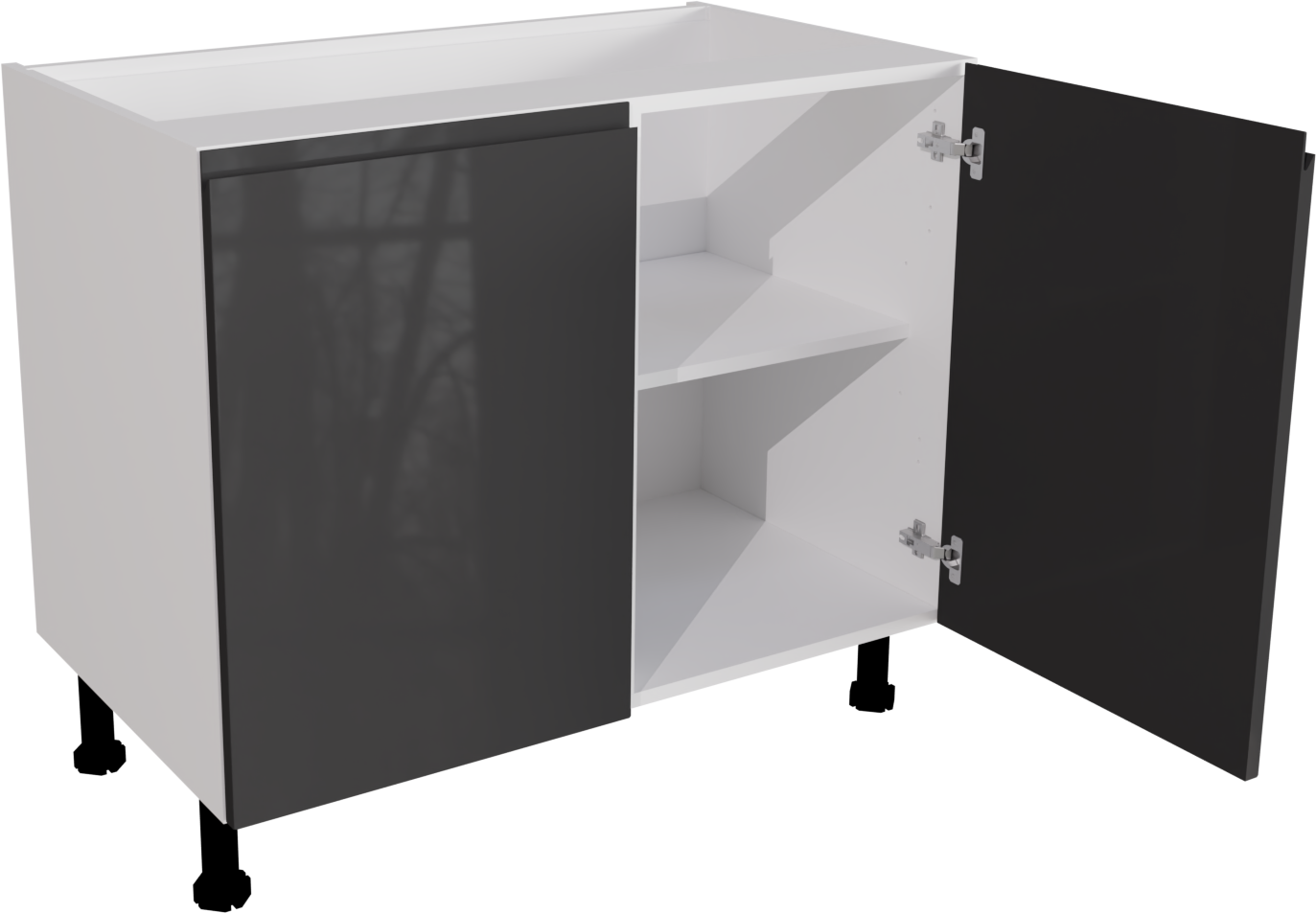 This is a 1000mm handleless high gloss graphite kitchen base unit, available to buy now from Flat Pack Kitchens. It is a matt base cabinet with a jayline high gloss graphite door. The door is pre-drilled for hinge holes. This listing includes the following parts: