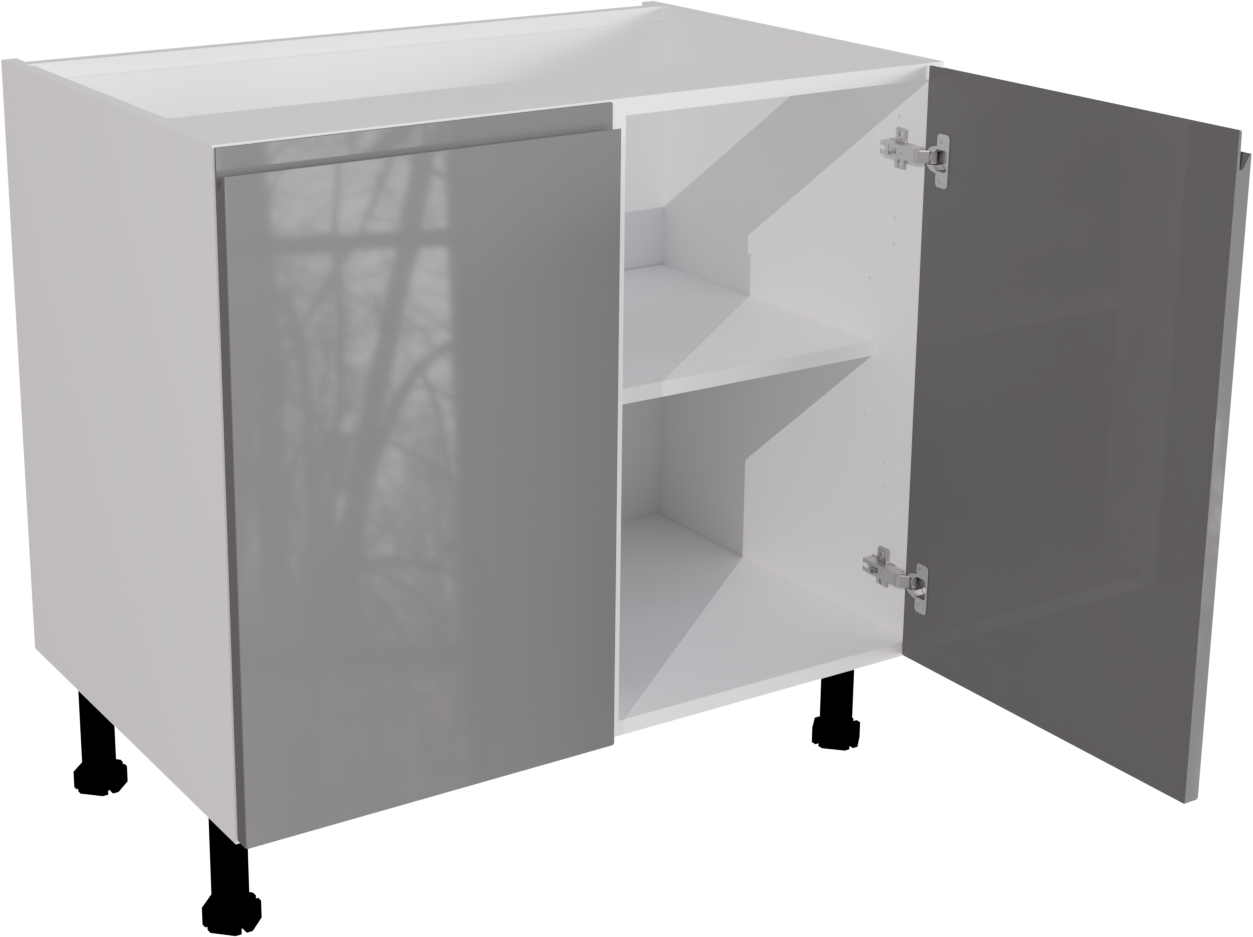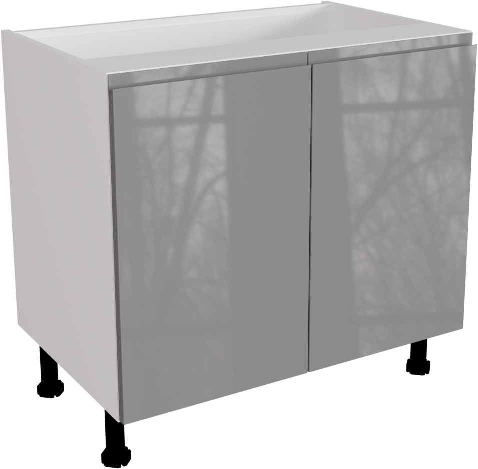 This is a handleless 900mm wide high gloss dust grey slab kitchen base unit from Flat Pack Kitchens. The unit includes two jayline high gloss dust grey kitchen doors and a double base unit. It also includes soft close handles and legs. The unit is flat packed and ready to assemble using the innovative cam and dowel technology.