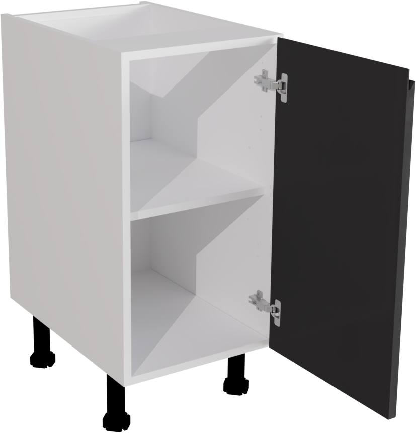 This is a 400mm handleless high gloss graphite kitchen base unit, available to buy now from Flat Pack Kitchens. It is a matt base cabinet with a jayline high gloss graphite door. The door is pre-drilled for hinge holes. This listing includes the following parts: