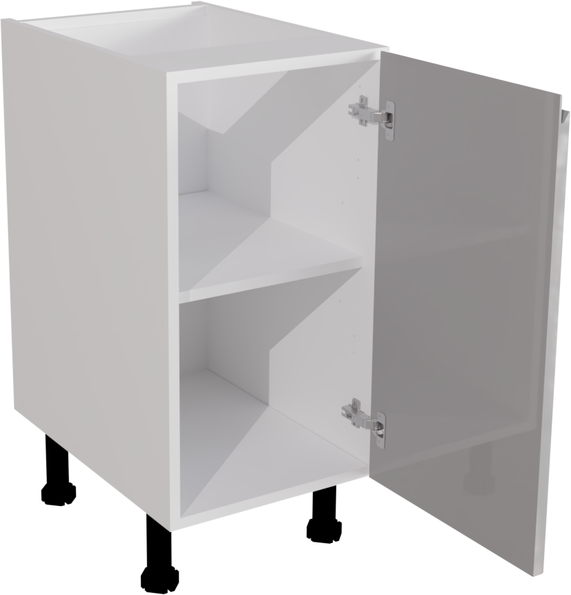 This is a 400mm handleless high gloss light grey kitchen base unit, available to buy now from Flat Pack Kitchens. It is a matt base cabinet with a jayline high gloss light grey door. The door is pre-drilled for hinge holes. This listing includes the following parts:
