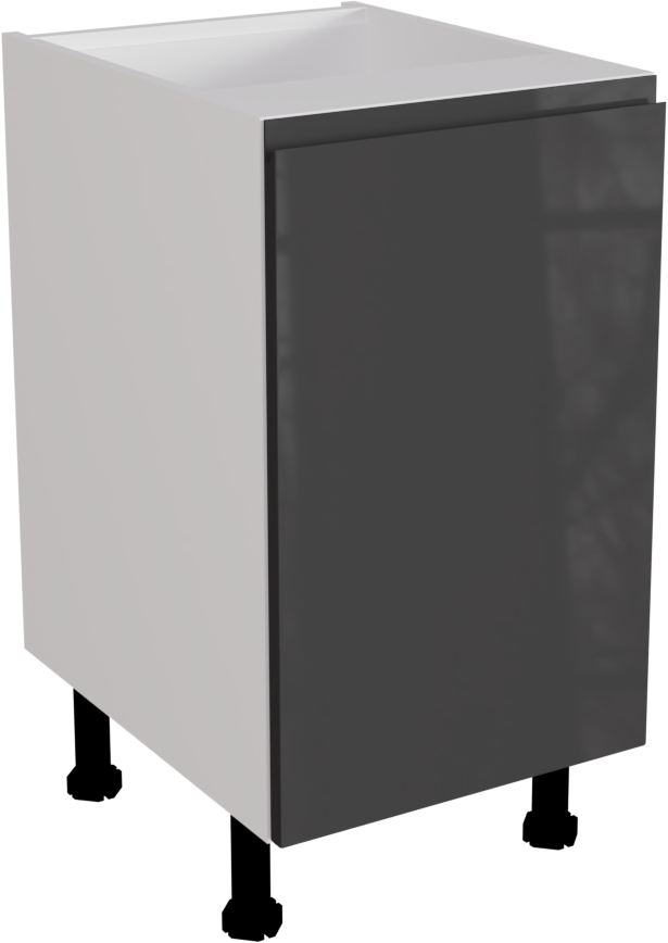 This is a 450mm handleless high gloss graphite kitchen base unit, available to buy now from Flat Pack Kitchens. It is a matt base cabinet with a jayline high gloss graphite door. The door is pre-drilled for hinge holes. This listing includes the following parts:
