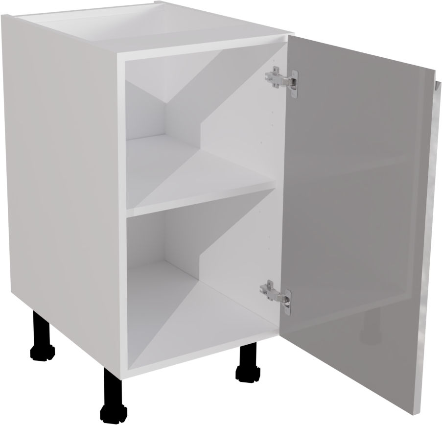 This is a 450mm wide handleless highline gloss light grey kitchen base unit. The kitchen unit includes a 450mm wide jayline gloss light grey kitchen door, a matt cabinet and the hinges and legs required to assemble the unit. The unit is delivered as a flat pack kitchen unit, but is easy to assemble using the cam and dowel technology. This listing includes the following parts: