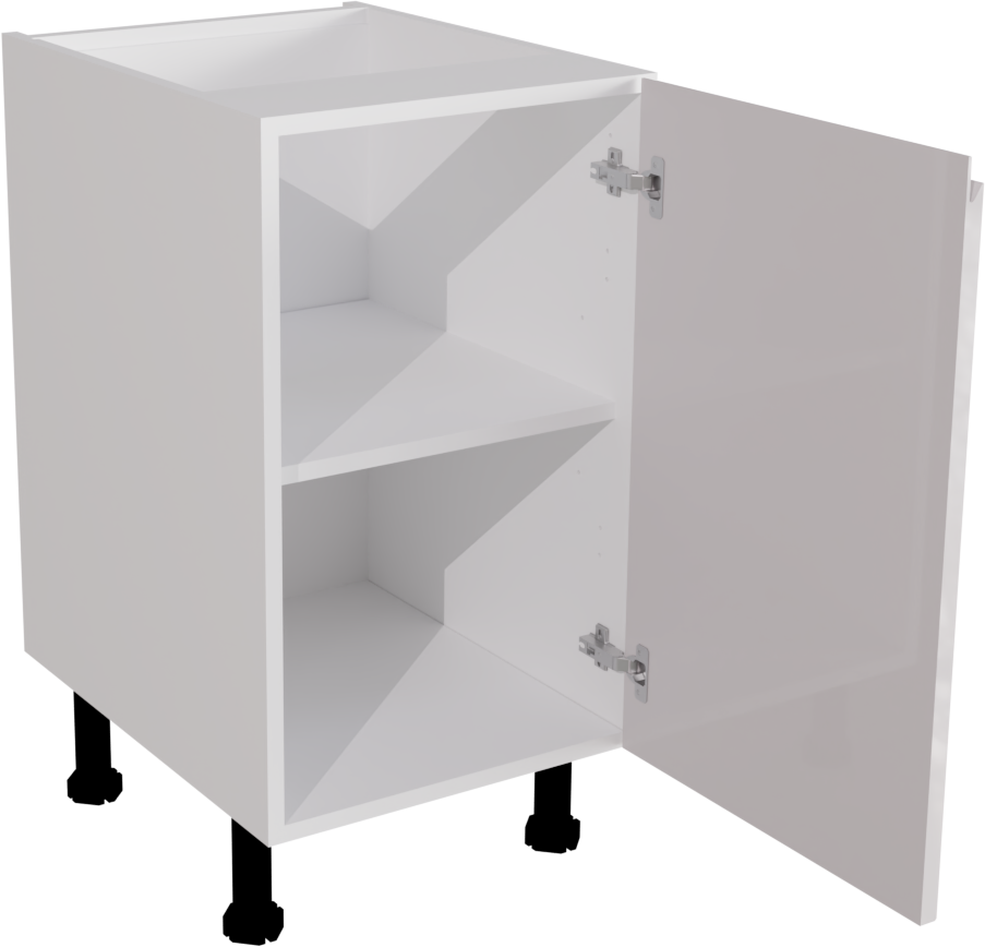 This is a 450mm wide handleless highline gloss white kitchen base unit. The kitchen unit includes a 450mm wide jayline gloss white kitchen door, a cabinet made of 18mm MFC (matt finish) and the hinges and legs required to assemble the unit. The unit is delivered as a flat pack kitchen unit, but is easy to assemble using the cam and dowel technology.