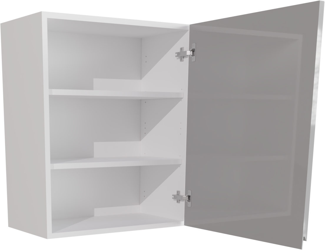 This is a 600mm handleless high gloss light grey kitchen wall unit. The unit is flat packed and easy to assemble. It includes a jayline high gloss light grey door, two shelves, wall hanging fixings and two soft close hinges. This listing includes the following parts: