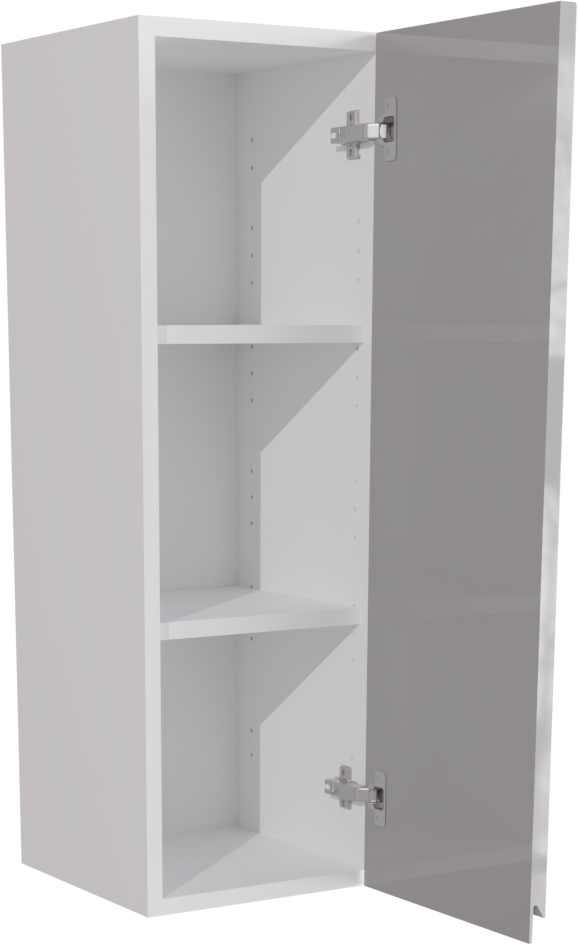 This is a 300mm handleless, gloss light grey tall kitchen wall unit(900mm high). It consists of a tall kitchen matt wall cabinet and a jayline high gloss light grey door. This unit includes the following parts: